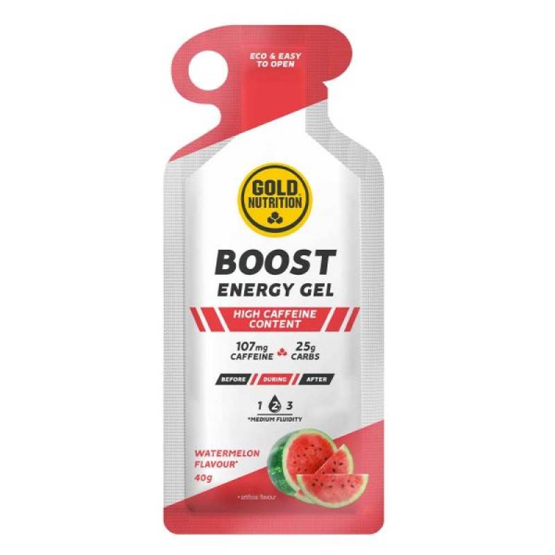 Boost Plus Energy Gel GoldNutrition® es un gel de liberación rápida con un alto contenido en cafeína, sodio e hidratos de carbono, diseñado para momentos en los que se necesita un refuerzo de energía. Boost Plus Energy Gel es un producto ideal para: Atrasar la aparición de fatiga física y mental. Aporte prolongado de energía. Mantener los niveles de azúcar en la sangre. Ciclistas, maratonianos, triatletas, tenistas, y todos los deportes con una duración superior a 1 hora. Combina bien con Goldrink como bebida de hidratación y con Fast Recovery para mejorar la recuperación. Consumir 1 gel por hora de ejercicio de resistencia; es imprescindible beber al menos 250 ml de agua por cada gel consumido.