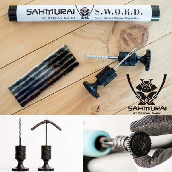 Sahmurai Sword: kit reparador de pinchazos para tubeless oculto en el manillar. Repara los agujeros que el sellante no puede solucionar. Diseñado por Stefan Sahm (Team Bulls), mecánico industrial y corredor profesional, que ha sido 3 veces campeón de la Absa Cape Epic. Es ideal para carreras maratón, aventuras multietapas o cualquier salida de fin de semana.