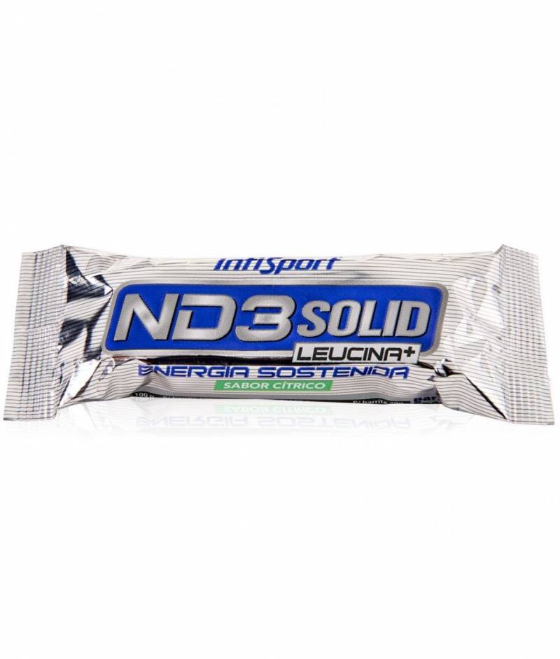 ND3® SOLID es una barrita con el delicioso sabor de la fruta natural prensada, su formula aporta aminoacidos esenciales BCAA´S en proporción 8:1:1 (Leucina+), L-Glutamina. Así como vitamina E y C que contribuyen a la protección de las células frente al daño oxidativo, vitamina B1 y B6 que contribuyen al metabolismo energético normal, magnesio que ayuda a disminuir el cansancio y la fatiga y zinc, que contribuye al funcionamiento normal del sistema inmunitario.
